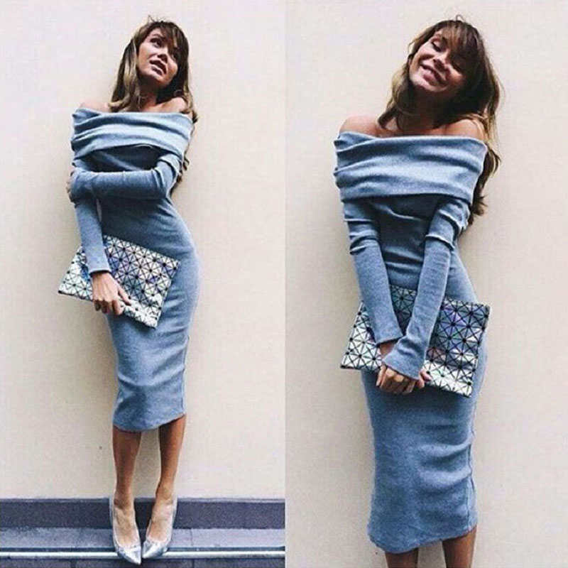 > Damen Bekleidung > Kleider > elegante Schulter ab schrägstrich Hals sexy Kleid ins Frühjahr Verband Kleider Party Night Club Kleid jurk Blauw lange