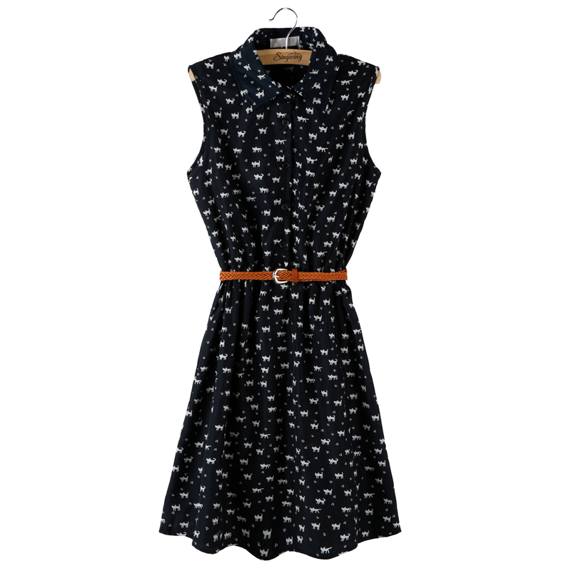 > Damen Bekleidung > Kleider > Sommer Stil neue Damen Kleid Katze Fussabdrücke Muster Zeigen Dünnen Hemd Kleid mit gürtel