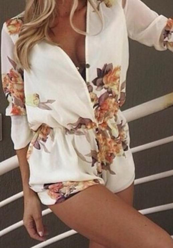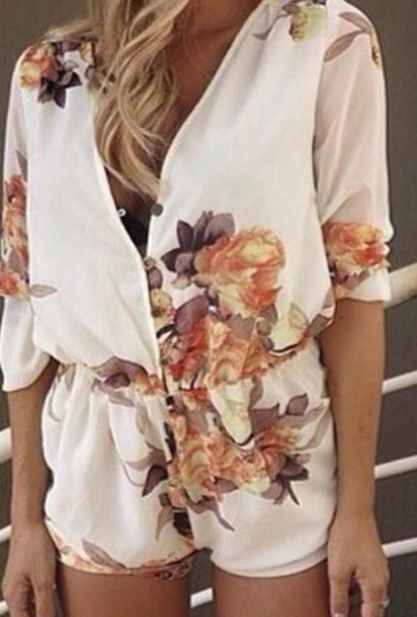 > Damen Bekleidung > Strampler > Sommer Overall Frau Print Chiffon Overalls Baumwolle Blume Hals Rompers sexy HochZeit Playsuit mit Button