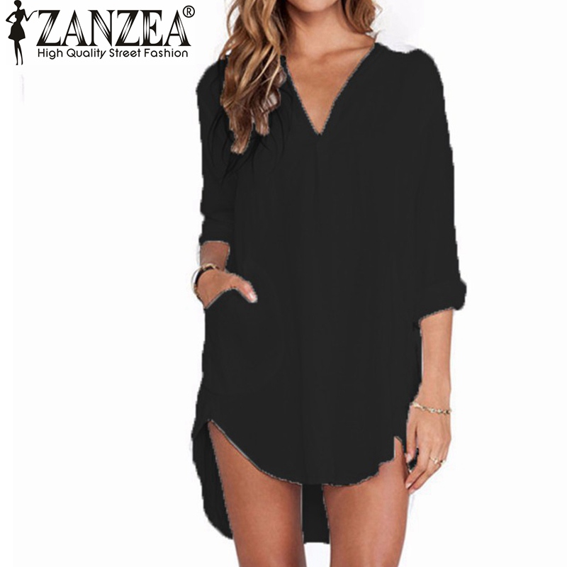 > Damen Bekleidung > Shirts > Sommer Damen lange oberteile sexy v Hals Tasche solide lange Ärmel Blusen lässig Lockere Mini Kleid Hemden uns plus