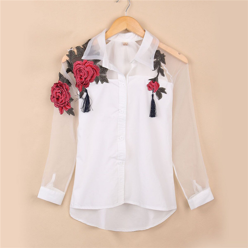> Damen Bekleidung > Shirts > Mode Sommer elegante Damen Bluse Blume Stickereien Vintage T Shirts Organza Ärmel Tops und Grösse s 3xl