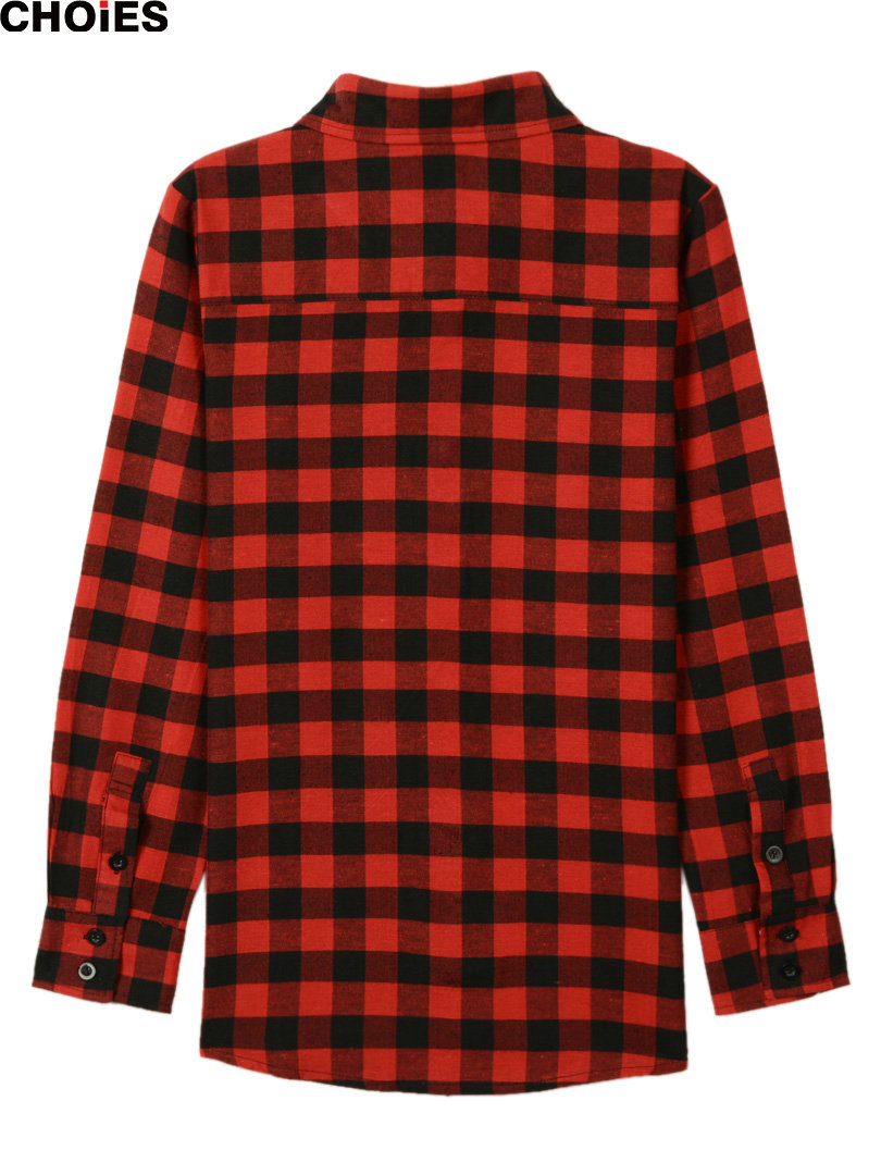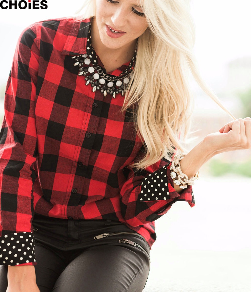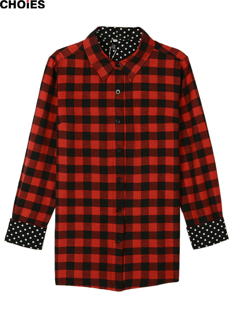 > Damen Bekleidung > Shirts > choies Damen Rot karierten Polka Dots gesäumten dreh Kragen Longarm Shirt Bluse im lager schnell Schiff s l Frühjahr