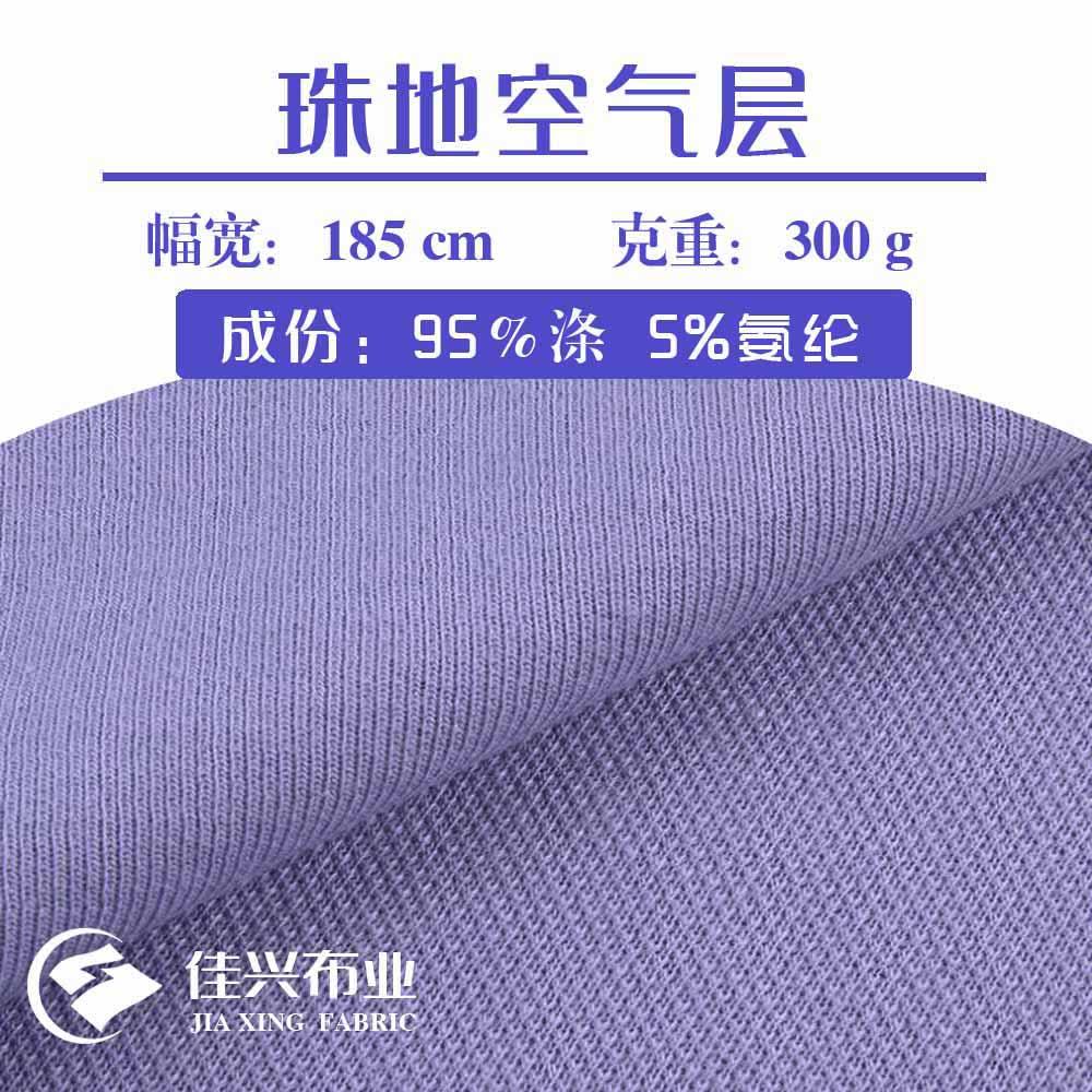 pattern solid color Main process dyeing use T-shirts/POLO shirts, sweatshirts, children's clothing Product name bead air layer Weight 300 Element 95% polyester 5% spandex Weaving style knitting fabric weave Weft knitting Door width 185 Article number J505 < /p>