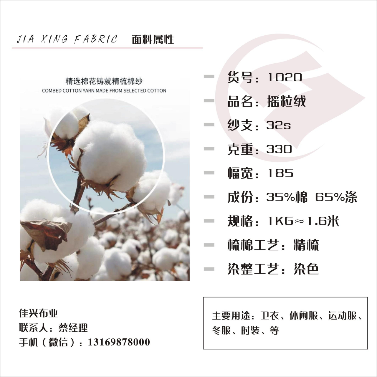 pattern solid color Main process dyeing use T-shirts/POLO shirts, sweatshirts, children's clothing Product name Polar fleece Weight 330 Element 35% cotton 65% polyester Weaving style knitting fabric weave Weft knitting Door width 185 Article number 1020 ![]()