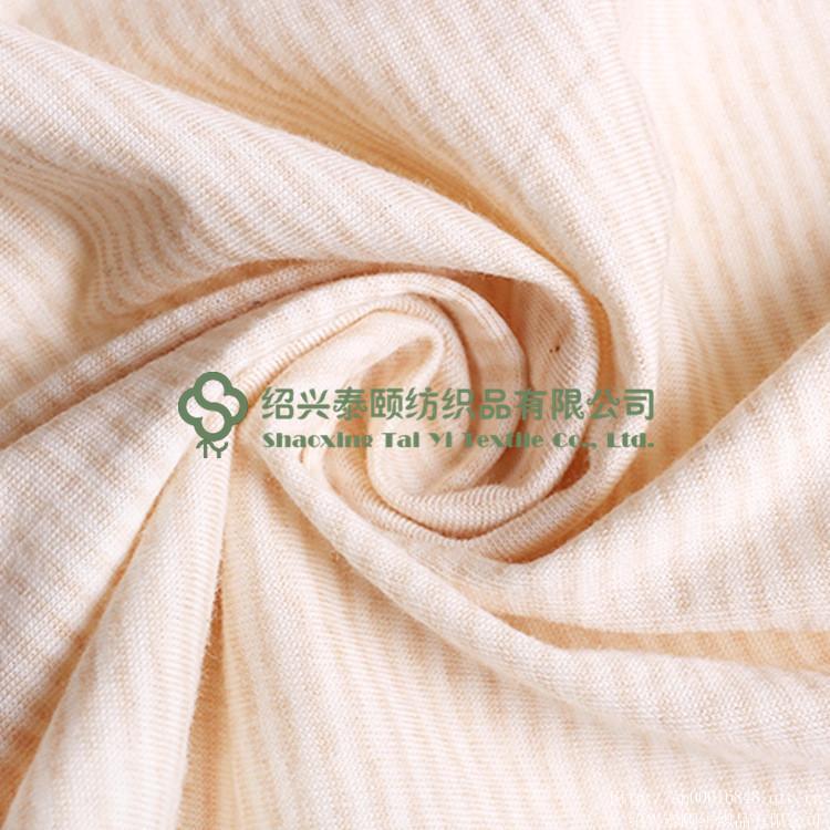 Colored cotton jersey single-sided fabric, 100% cotton knitted fabric, GOTS organic cotton infant knitted fabric, pattern: stripes, weight (g/㎡): 125 g/㎡, main process: yarn-dyed weaving, others, ingredients: 100% cotton, Yarn count: 32, color: brown, white