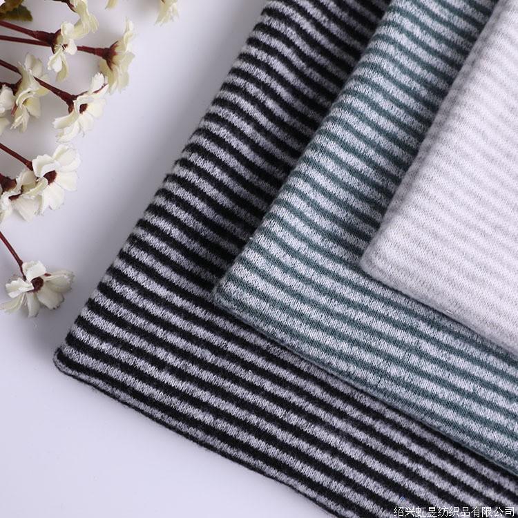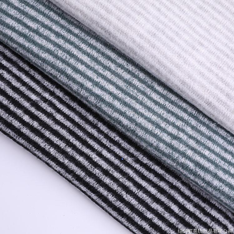 Brushed yarn-dyed striped fabric positioning printing abstract single-sided combed coarse-knit fabric sportswear fashion fabric is pattern: stripes, weight (g/㎡): 200 g/㎡, main process: dyeing, yarn-dyed weaving, composition: R25% T72 % SP3%, product name: brushed yarn-dyed rib, weaving method: knitting, clothing fabric: skirt