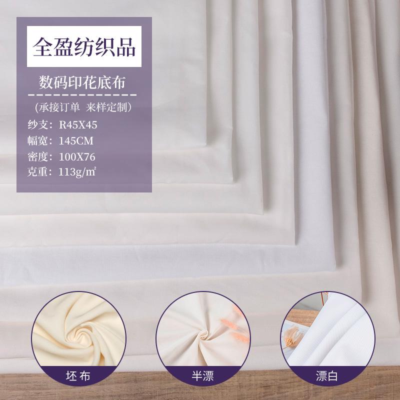 Pure cotton white cloth, pure cotton bleached cloth, digital printing base fabric, water printing base fabric, warp yarn count: 45S, weft yarn count: 45S, warp yarn composition: 100% R, weft yarn composition: same warp yarn, warp yarn density: 100, weft yarn density: 76, door width: 145, edge: raw edge