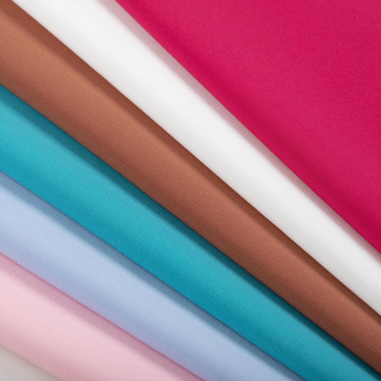 100D stretch chiffon 100D/72F semi-gloss FDY18*8 26 215 is warp yarn count: 18, weft yarn count: 8, warp yarn composition: 100D/72F semi-gloss FDY, weft yarn composition: 100+40 spandex covered yarn, warp yarn density :26, weft density: 26, width: 215, edge: plain edge